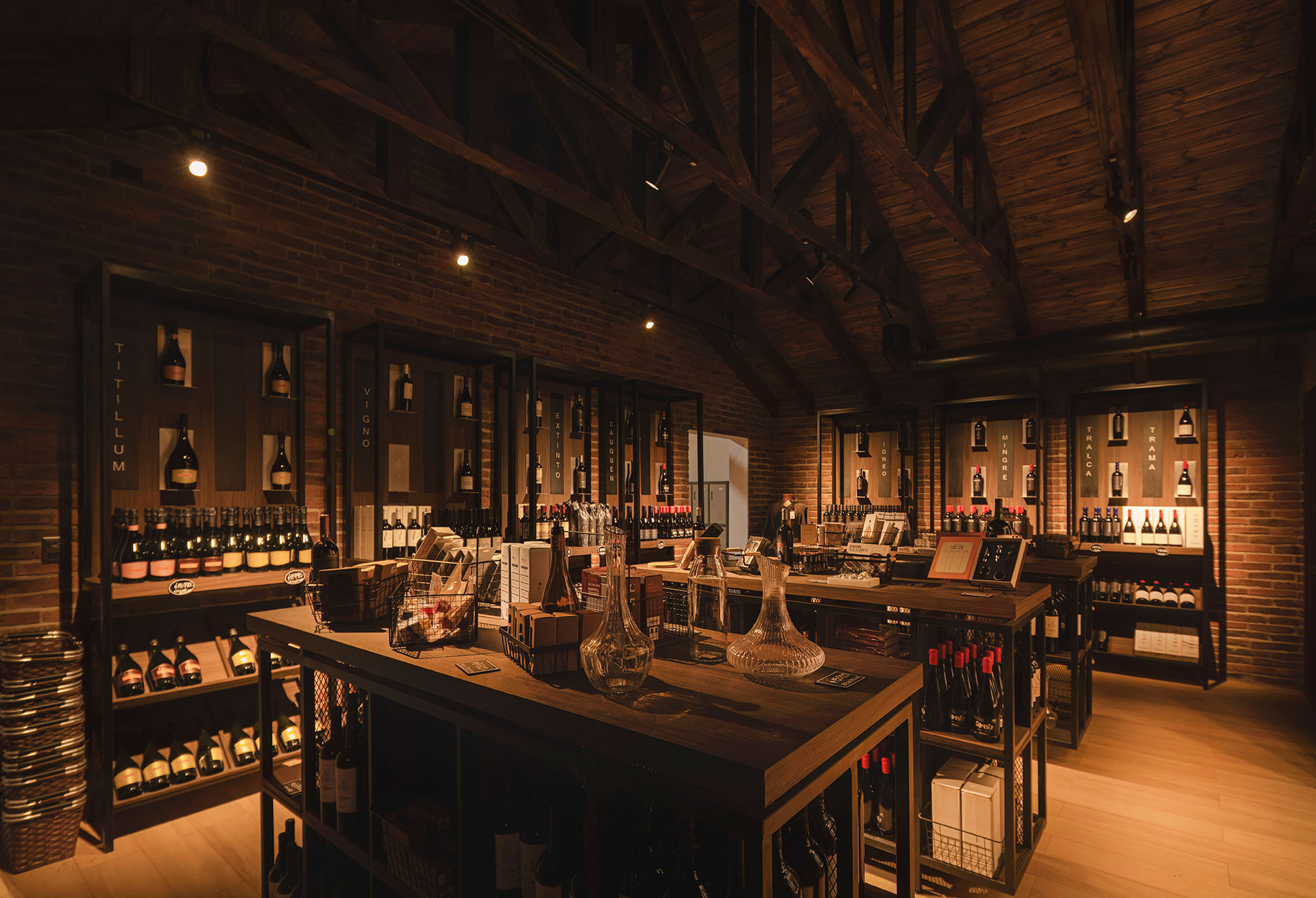 Para la sala de vinos premium, la remodelación interior implicó la reubicación de los servicios sanitarios, liberando un área destinada exclusivamente a exhibir los mejores vinos de la viña. Se recuperó la altura original, dejando a la vista las cerchas de la estructura, y se vistió el espacio con materiales nobles como madera y ladrillo, acompañados de una iluminación cálida y mobiliario diseñado a medida, logrando una atmósfera de alta calidad y calidez.