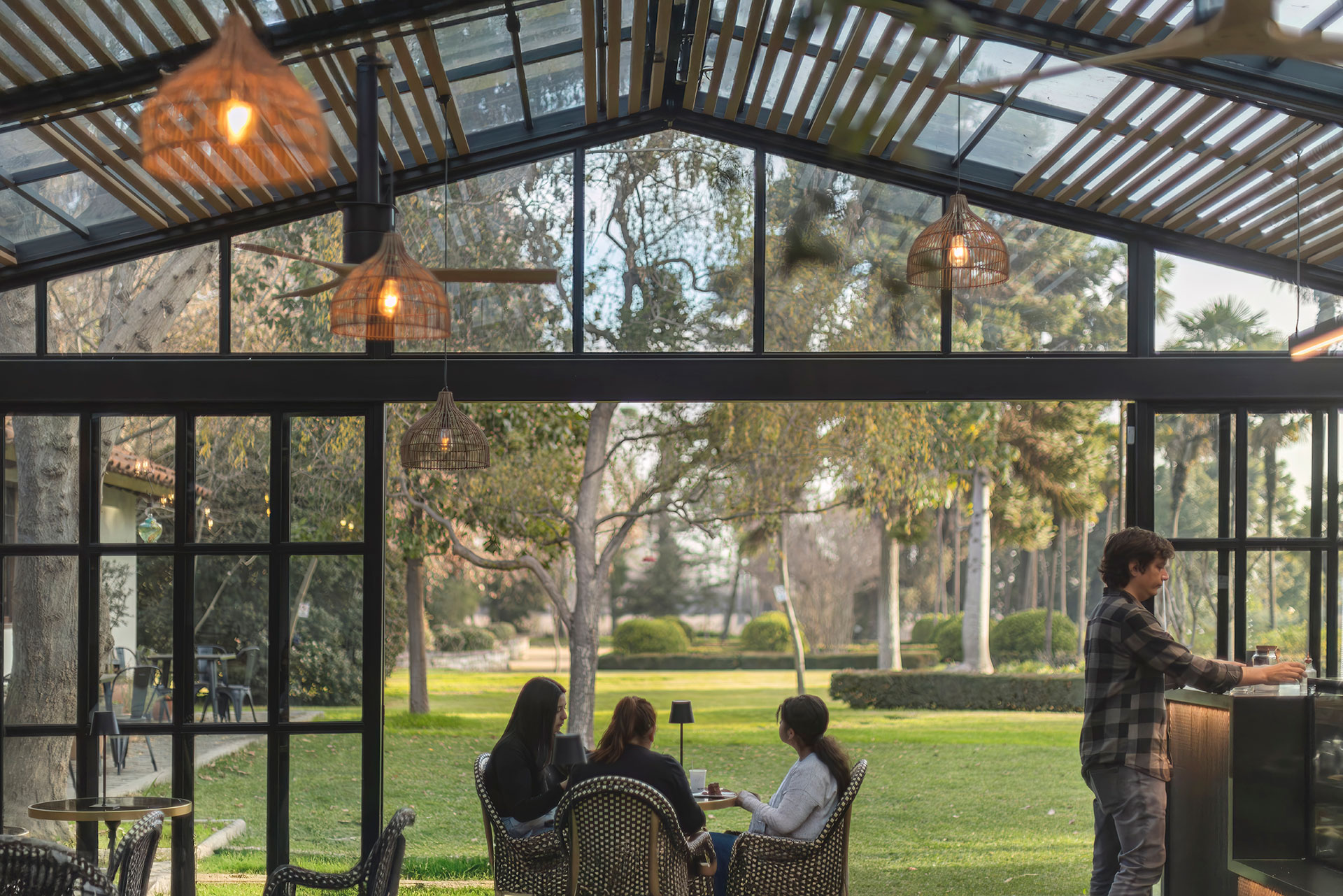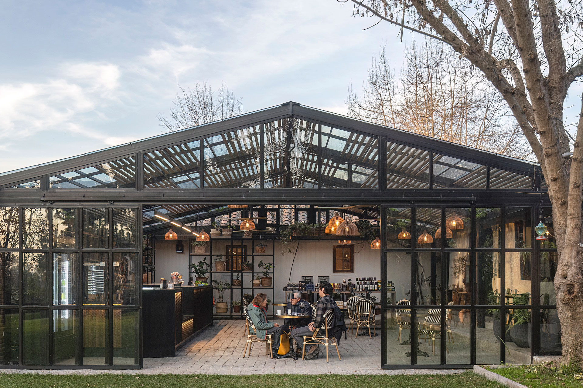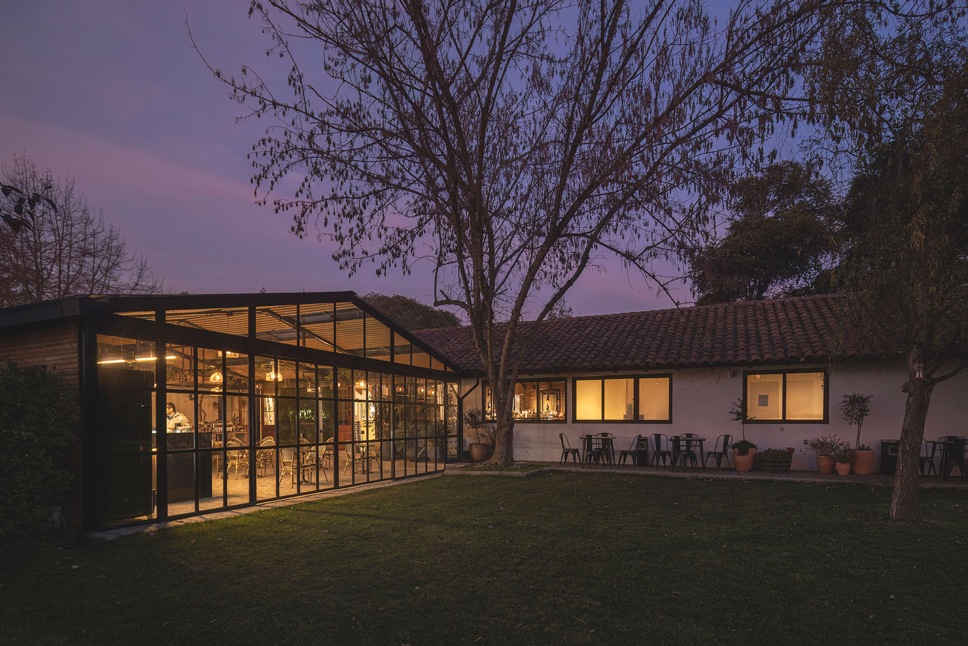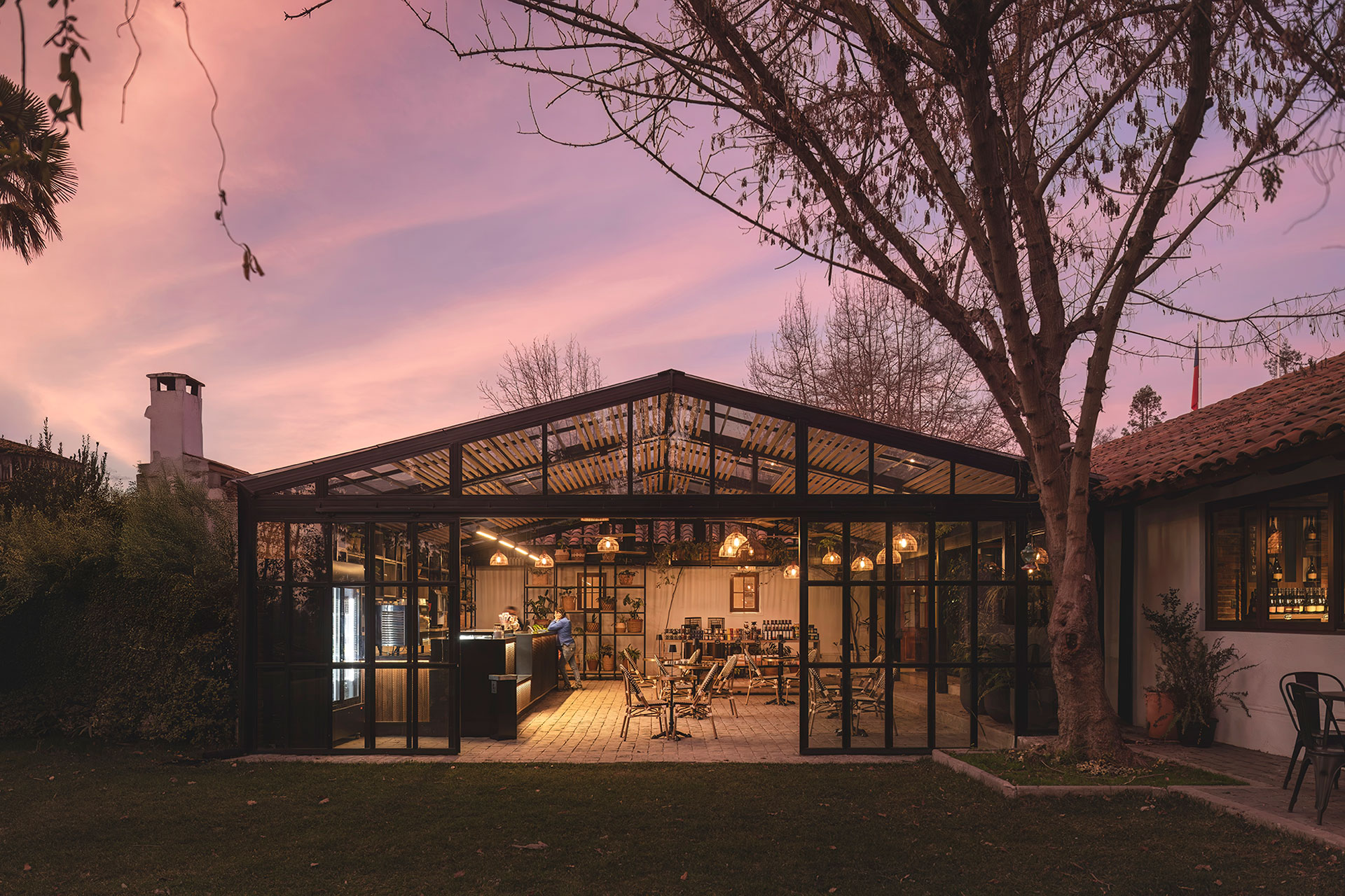 Para la cafetería, la intervención arquitectónica se desarrolla sobre la terraza de adoquines que funciona como patio central entre las construcciones existentes. El principal desafío consistió en dialogar respetuosamente con la arquitectura original de la viña, al mismo tiempo que se incorporaba un nuevo servicio. La propuesta materializa un volumen acristalado a dos aguas y abierto hacia los jardines diseñados por Monsieur George Henri Dubuois a finales del siglo XIX.